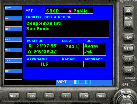Por exemplo. Estando na tela inicial de NAV, rode o botão grande para a direita (clique uma vez na seta para a direita). Isso fará com que o grupo deixe de ser NAV e passe a ser o WPT. Note que no grupo WPT existem não só duas páginas, como no NAV, e sim sete páginas. Você provavelmente estará na primeira delas mostrada na figura abaixo (Airport Location).